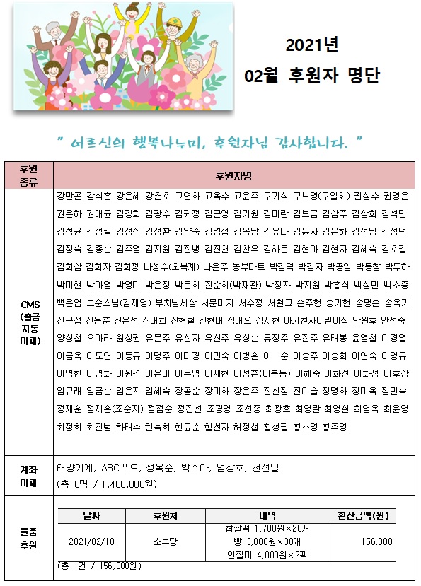2021년 02월 후원자 현황입니다. 게시글 작성정보 작성자 서원노인복지관 작성일 21-03-05 16:47 조회수 1,686 댓글수 0 목록 게시글 본문 첨부파일 1개 2021년 02월 후원자 명단 홈페이지.jpg (198.0K) 0회 다운로드 첨부일시 : 2021-03-05 16:47:04 이전글 2021년 03월 후원자 현황입니다. 21-04-05 다음글 2021년 01월 후원자 현황입니다. 21-02-05 댓글 0 등록된 댓글이 없습니다. 목록