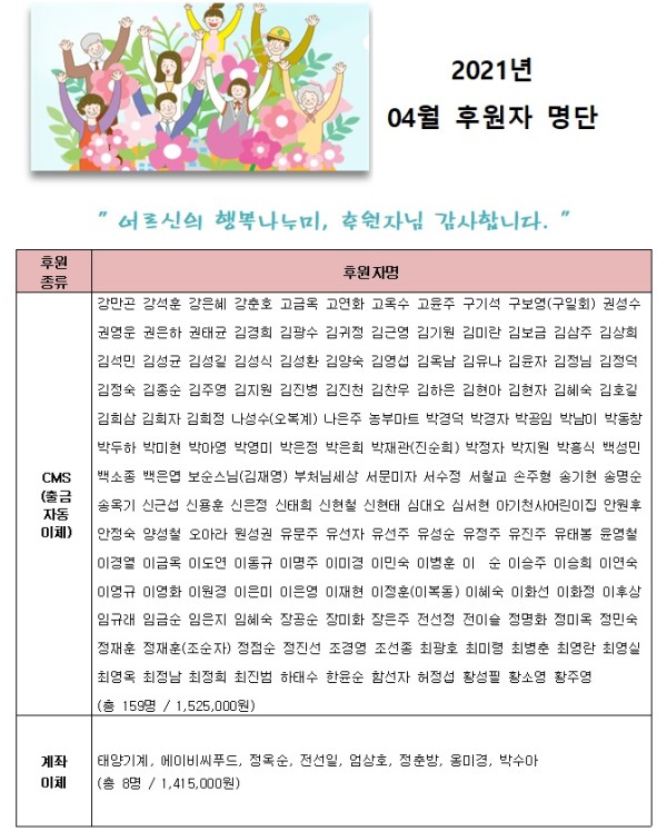 2021년 04월 후원자 현황입니다. 게시글 작성정보 작성자 서원노인복지관 작성일 21-05-04 13:28 조회수 1,515 댓글수 0 목록 게시글 본문 첨부파일 1개 2021년 04월 후원자 명단 홈페이지.jpg (205.2K) 0회 다운로드 첨부일시 : 2021-05-04 13:28:38 이전글 2021년 03월 자원봉사자 현황 21-05-11 다음글 2021년 03월 후원자 현황입니다. 21-04-05 댓글 0 등록된 댓글이 없습니다. 목록