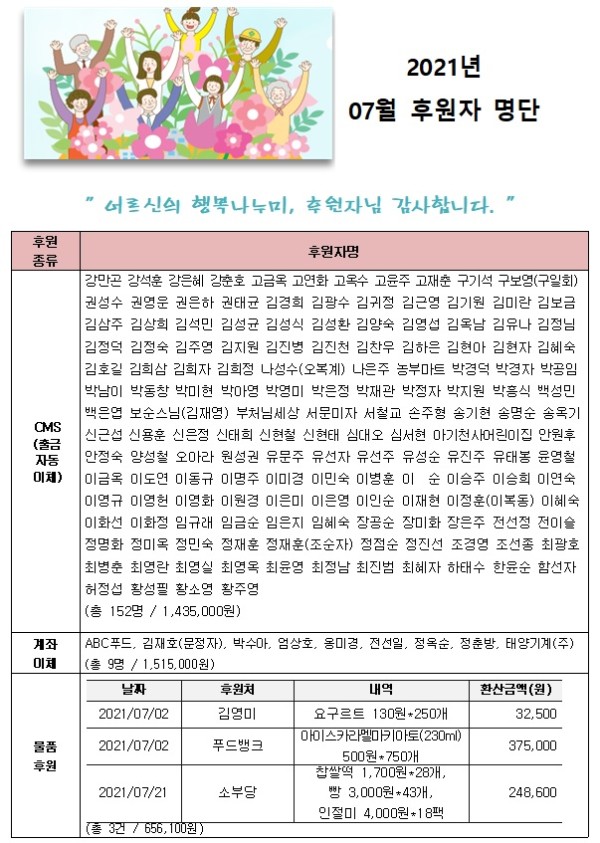 2021년 07월 후원자 현황입니다. 게시글 작성정보 작성자 서원노인복지관 작성일 21-08-06 14:35 조회수 1,550 댓글수 0 목록 게시글 본문 첨부파일 1개 2021년 07월 후원자 명단 홈페이지.jpg (228.0K) 0회 다운로드 첨부일시 : 2021-08-06 14:35:36 이전글 2021년 08월 자원봉사자 현황 21-09-02 다음글 2021년 06월 후원자 현황입니다. 21-07-09 댓글 0 등록된 댓글이 없습니다. 목록