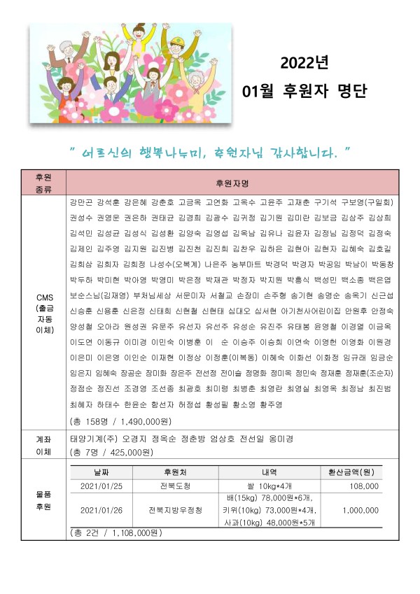 2022년 01월 후원자 현황입니다. 게시글 작성정보 작성자 서원노인복지관 작성일 22-02-07 17:03 조회수 1,318 댓글수 0 목록 게시글 본문 첨부파일 1개 2022년 01월 후원자 명단 홈페이지.jpg (3.2M) 0회 다운로드 첨부일시 : 2022-02-07 17:03:01 이전글 2022년 02월 후원자 현황입니다. 22-03-03 다음글 2021년 12월 후원자 현황입니다. 22-01-06 댓글 0 등록된 댓글이 없습니다. 목록