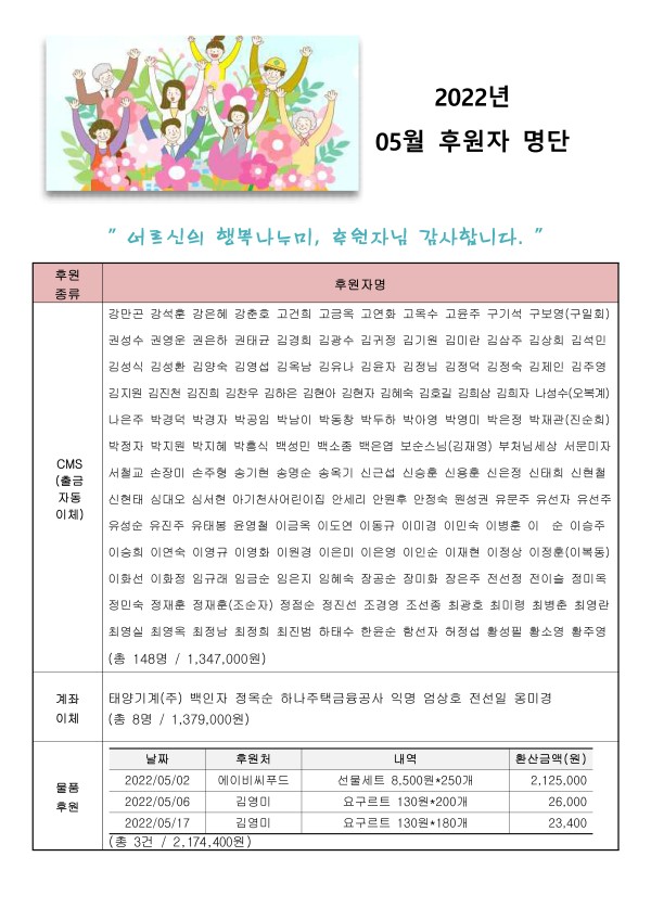 2022년 05월 후원자 현황입니다. 게시글 작성정보 작성자 서원노인복지관 작성일 22-06-07 15:25 조회수 1,118 댓글수 0 목록 게시글 본문 첨부파일 1개 2022년 05월 후원자 명단 홈페이지.jpg (3.1M) 0회 다운로드 첨부일시 : 2022-06-07 15:25:22 이전글 2022년 05월 자원봉사자 현황 22-06-08 다음글 2022년 04월 자원봉사자 현황 22-05-06 댓글 0 등록된 댓글이 없습니다. 목록