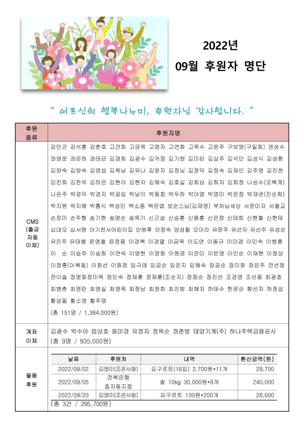 2022년 09월 후원자 현황입니다. 게시글 작성정보 작성자 서원노인복지관 작성일 22-10-05 14:39 조회수 1,027 댓글수 0 목록 게시글 본문 첨부파일 1개 2022년 09월 후원자 명단 홈페이지.jpg (3.2M) 0회 다운로드 첨부일시 : 2022-10-05 14:39:34 이전글 2022년 10월 자원봉사자 현황 22-11-01 다음글 2022년 09월 자원봉사자 현황 22-10-05 댓글 0 등록된 댓글이 없습니다. 목록