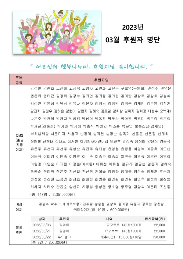 2023년 03월 후원자 현황입니다. 게시글 작성정보 작성자 서원노인복지관 작성일 23-04-06 09:59 조회수 838 댓글수 0 목록 게시글 본문 첨부파일 1개 2023년 03월 후원자 명단 홈페이지.jpg (3.2M) 0회 다운로드 첨부일시 : 2023-04-06 09:59:20 이전글 2023년 4월 자원봉사 현황 23-05-04 다음글 2023년 3월 자원봉사 현황 23-04-03 댓글 0 등록된 댓글이 없습니다. 목록