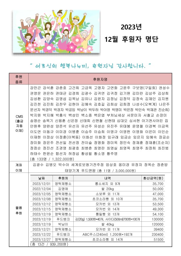 2023년 12월 후원자 현황입니다. 게시글 작성정보 작성자 서원노인복지관 작성일 24-01-11 14:52 조회수 518 댓글수 0 목록 게시글 본문 첨부파일 1개 2023년 12월 후원자 명단 홈페이지.jpg (1.9M) 0회 다운로드 첨부일시 : 2024-01-11 14:52:20 이전글 2024년 1월 자원봉사 현황 24-02-05 다음글 2023년12월 자원봉사 현황 24-01-02 댓글 0 등록된 댓글이 없습니다. 목록