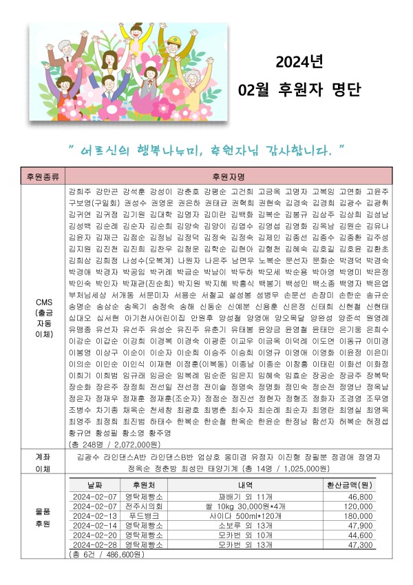 2024년 02월 후원자 현황입니다. 게시글 작성정보 작성자 서원노인복지관 작성일 24-03-07 16:53 조회수 518 댓글수 0 목록 게시글 본문 첨부파일 1개 2024년 02월 후원자 명단 홈페이지.jpg (2.0M) 0회 다운로드 첨부일시 : 2024-03-07 16:53:57 이전글 2024년 3월 자원봉사 현황 24-04-01 다음글 2024년 2월 자원봉사 현황 24-03-04 댓글 0 등록된 댓글이 없습니다. 목록