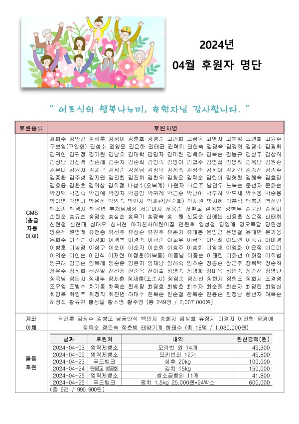 2024년 04월 후원자 현황입니다. 게시글 작성정보 작성자 서원노인복지관 작성일 24-05-10 17:09 조회수 492 댓글수 0 목록 게시글 본문 첨부파일 1개 2024년 04월 후원자 명단 홈페이지.jpg (2.0M) 0회 다운로드 첨부일시 : 2024-05-10 17:09:56 이전글 2024년 05월 후원자 현황입니다. 24-06-07 다음글 2024년 4월 자원봉사 현황 24-05-02 댓글 0 등록된 댓글이 없습니다. 목록