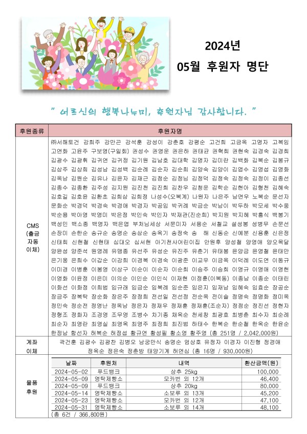 2024년 05월 후원자 현황입니다. 게시글 작성정보 작성자 서원노인복지관 작성일 24-06-07 15:26 조회수 473 댓글수 0 목록 게시글 본문 첨부파일 1개 2024년 05월 후원자 명단 홈페이지.jpg (2.0M) 0회 다운로드 첨부일시 : 2024-06-07 15:26:35 이전글 2024년 5월 자원봉사자 현황 24-07-01 다음글 2024년 04월 후원자 현황입니다. 24-05-10 댓글 0 등록된 댓글이 없습니다. 목록