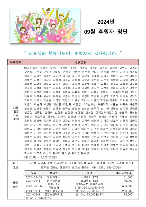 2024년 09월 후원자 현황입니다. 게시글 작성정보 작성자 서원노인복지관 작성일 24-10-07 12:06 조회수 459 댓글수 0 목록 게시글 본문 첨부파일 1개 2024년 09월 후원자 명단 홈페이지.jpg (2.0M) 0회 다운로드 첨부일시 : 2024-10-07 12:06:38 이전글 2024년 10월 후원자 현황입니다. 24-11-11 다음글 2024년 9월 자원봉사자 현황 24-10-04 댓글 0 등록된 댓글이 없습니다. 목록