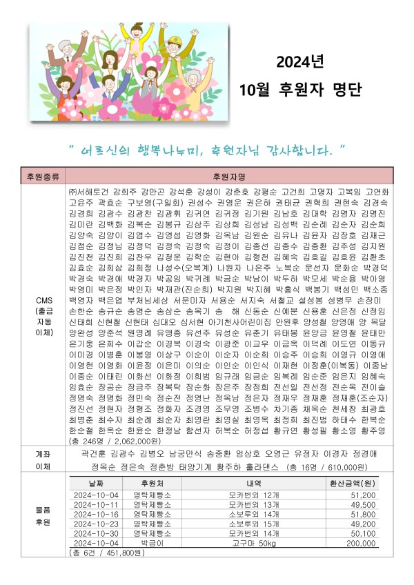 2024년 10월 후원자 현황입니다. 게시글 작성정보 작성자 서원노인복지관 작성일 24-11-11 15:53 조회수 412 댓글수 0 목록 게시글 본문 첨부파일 1개 2024년 10월 후원자 명단 홈페이지.jpg (1.3M) 0회 다운로드 첨부일시 : 2024-11-11 15:53:31 이전글 2024년 10월 자원봉사자 현황 24-11-22 다음글 2024년 09월 후원자 현황입니다. 24-10-07 댓글 0 등록된 댓글이 없습니다. 목록