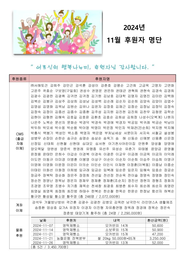 2024년 11월 후원자 현황입니다. 게시글 작성정보 작성자 서원노인복지관 작성일 24-12-04 16:22 조회수 645 댓글수 0 목록 게시글 본문 첨부파일 1개 2024년 11월 후원자 명단 홈페이지_1.jpg (1.2M) 0회 다운로드 첨부일시 : 2024-12-04 16:22:48 이전글 2024년 11월 자원봉사자 현황 24-12-13 다음글 2024년 10월 자원봉사자 현황 24-11-22 댓글 0 등록된 댓글이 없습니다. 목록