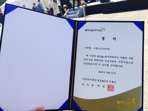 서원노인복지관은 지난 8월에 KT&G복지재단 공모사업에 신청하여 차량(경차 1대)가 선정되었습니다.