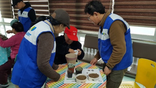 어르신들과 봉사자가 함께 원예프로그램을 진행하고