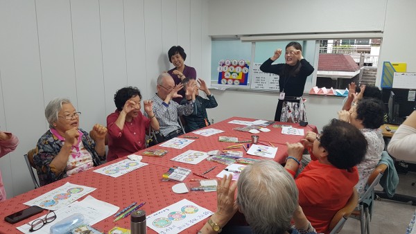 서로 마주보고 앉아서 즐겁게 프로그램에 참여하는 어르신들을