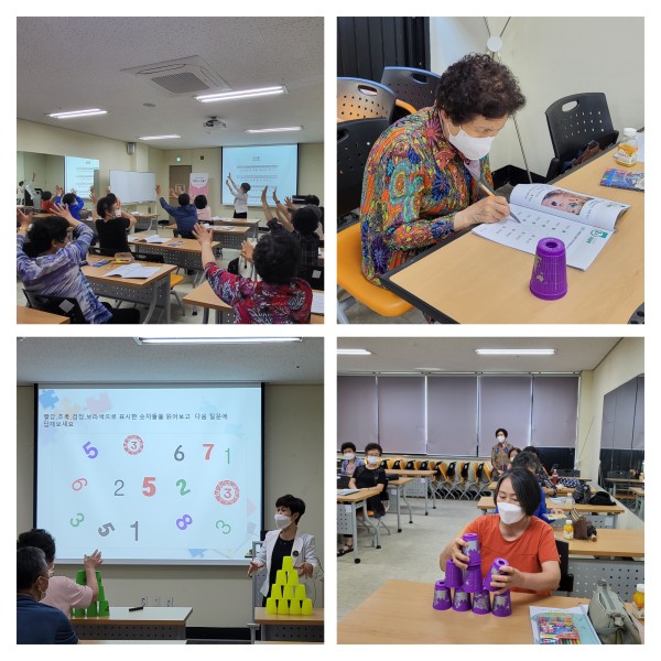 3회기에는 기억짝꿍 학습지를 활용하여 치매예방프로그램(지남력, 주의집중력, 기억력, 시지각, 시공간, 계산력, 문제해결력)과 웃음치료, 낙상예방운동이 이루어졌습니다. 치매예방프로그램의 경우, ppt자료 및 동영상을 활용하여 어르신들이 학습지를 학습하는 과정에서 이해하기 쉬웠고 어르신들은 이번 회기에서 ‘컵타놀이’와 ‘율동에 맞게 노래부르기’에 대한 흥미가 가장 높으셨습니다. 이 활동은 리듬을 타며 즐길 수 있고 박자 감각을 익혀 어르신의 뇌운동에 도움을 줄 수 있었습니다.