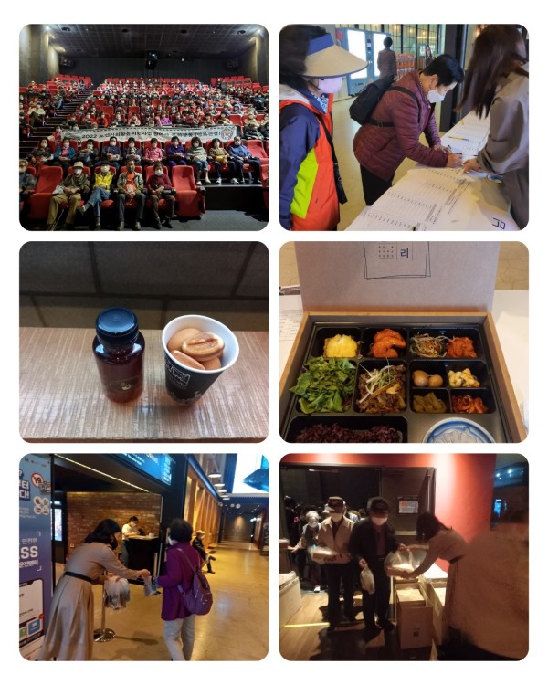 어르신들께서는 영화관에 와본적이 없어서 떨렸다고 말씀해 주시고, 영화에 예전에 좋아하던 노래가 나와서 집에 가서 다시 찾아서 들었고 도시락도 너무 맛있었다며 감사의 말씀을 전해주셨습니다