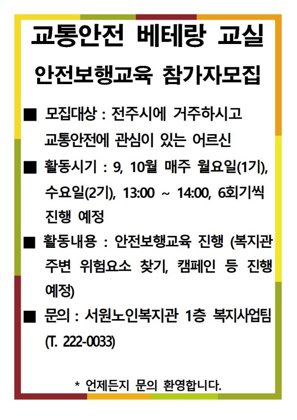 [2020. 08. ~ 정원완료시] 교통안전 베테랑 교실 게시글 작성정보 작성자 서원노인복지관 작성일 20-08-21 09:21 조회수 2,557 댓글수 0 목록 게시글 본문 첨부파일 1개 교통안전 베테랑 교실 게시판 홍보지.jpg (161.8K) 0회 다운로드 첨부일시 : 2020-08-21 09:21:42 이전글 [2020.11.23. ~ 12.18.] 2021년 노인일자리 및 사회활동지원사업 공익활동(11개월) 참여자 접수 20-12-08 다음글 [2020.08.20.~정원완료시] 분관 / 2020 평생교육 수강신청 기간 안내 20-08-14 댓글 0 등록된 댓글이 없습니다. 목록