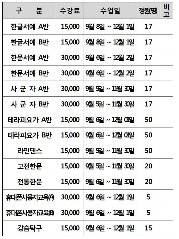 ■ 일시: 2016년 08월 22일(월) 오전 9시부터 충원시까지 ■ 장소: 복지관 1층 사무실 ■ 대상: 복지관회원 ■ 내용: 10개 유료프로그램, 15개 과정 접수 ■ 주관: 서원노인복지관(사회참여팀)