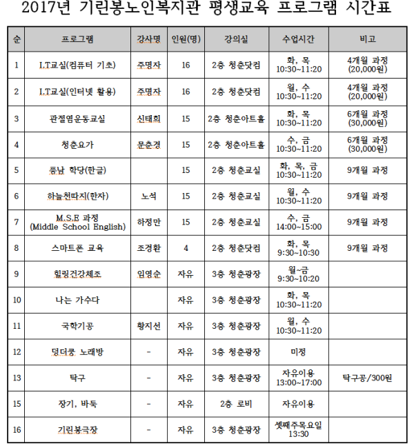 2017년 기린봉노인복지관 사회교육 시간표입니다.