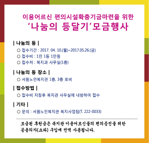 서원노인복지관에서는 이용어르신 편의시설확충 기금마련을 위한 나눔의 등 모금행사를 진행합니다.