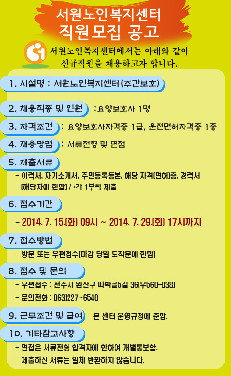 [모집공고] 서원노인복지센터 직원 모집합니다-마감 게시글 작성정보 작성자 서원노인복지관 작성일 14-07-15 00:00 조회수 1,932 댓글수 0 목록 게시글 본문 서원노인복지센터 직원을 모집합니다. 첨부파일 1개 popup(20140715)-center01.jpg (193.0K) 0회 다운로드 첨부일시 : 2014-07-15 00:00:00 이전글 [이용안내] 서원노인복지관 공사로 인한 이용 안내(CCTV 설치 진행) 14-07-21 다음글 [주간식단안내] 7월 세째주(2014.07.14~07.19) 복지관 주간식단표 안내 14-07-14 댓글 0 등록된 댓글이 없습니다. 목록