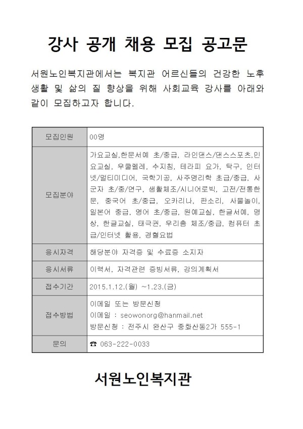 2015 사회교육강사 모집 안내 게시글 작성정보 작성자 서원노인복지관 작성일 15-01-05 00:00 조회수 305 댓글수 0 목록 게시글 본문 서원노인복지관에서는 사회교육 강사를 모집합니다 첨부파일 1개 2015 사회교육 강사 모집001.jpg (143.4K) 0회 다운로드 첨부일시 : 2015-01-05 00:00:00 이전글 [주간식단] 2015년 1월 둘째주(2015.01.12~01.17)복지관 주간식단 안내 15-01-12 다음글 [주간식단] 2015년 1월첫주(2015.01.05~01.10)복지관 주간식단 안내 15-01-05 댓글 0 등록된 댓글이 없습니다. 목록