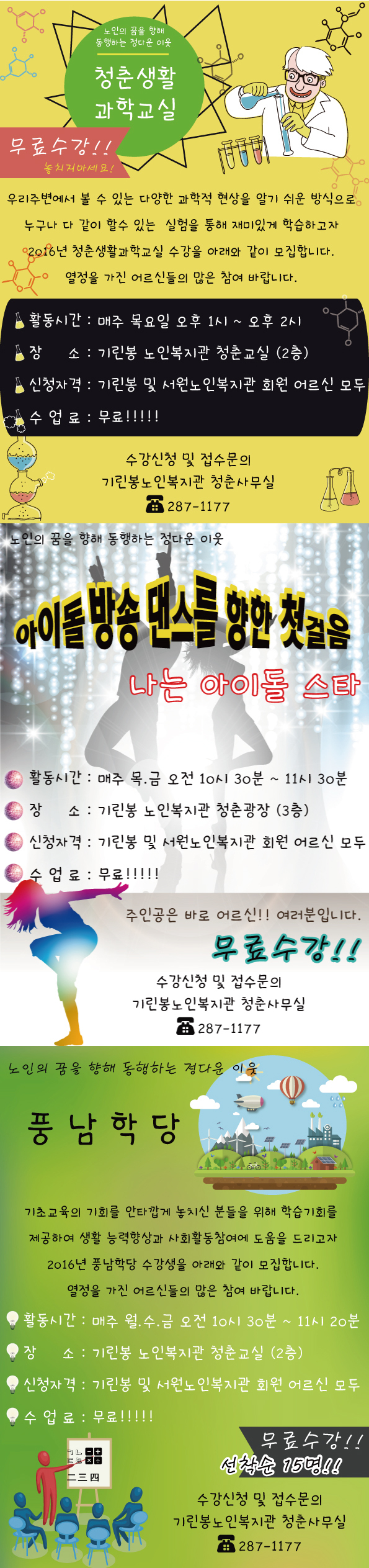 기린봉노인복지관 프로그램 홍보 게시글 작성정보 작성자 서원노인복지관 작성일 16-02-26 16:50 조회수 1,671 댓글수 0 목록 게시글 본문 기린봉노인복지관 프로그램 홍보 첨부파일 1개 무제-1.jpg (1,004.7K) 0회 다운로드 첨부일시 : 2016-02-26 16:50:54 이전글 [주간식단] 2016년 3월 첫주(02.29~03.05) 복지관 주간식단 안내 16-02-29 다음글 노인 재능나눔 활동지원사업 참여 어르신 모집 16-02-16 댓글 0 등록된 댓글이 없습니다. 목록