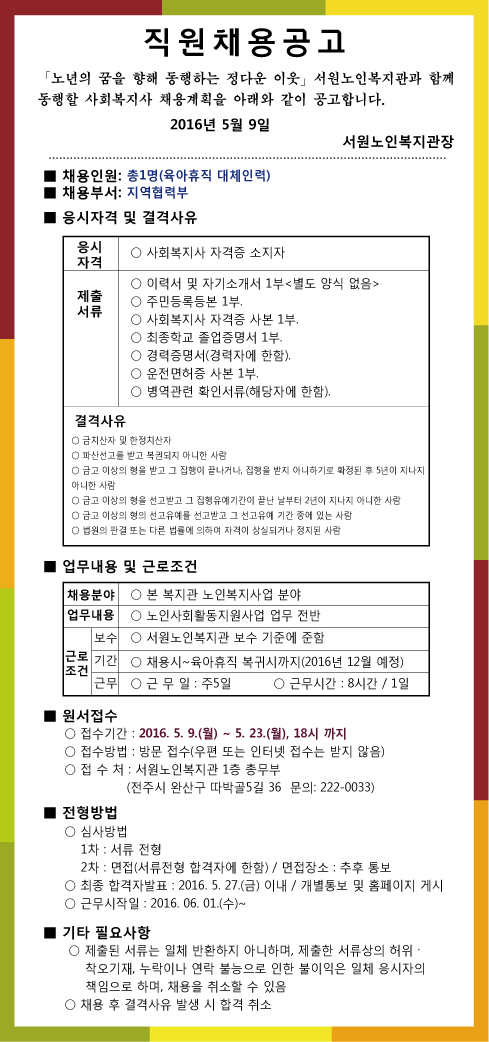 [모집공고]서원노인복지관 사회복지사(육아휴직 대체) 모집 공고