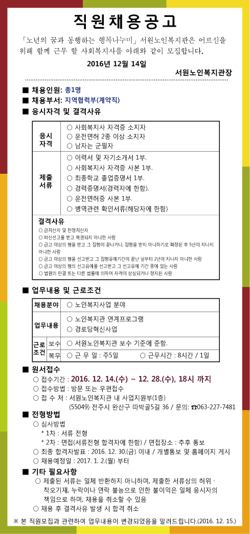 [모집공고] 서원노인복지관 사회복지사 채용공고
