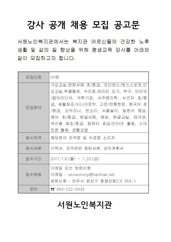 2017 평생교육 강사 모집 게시글 작성정보 작성자 서원노인복지관 작성일 17-01-05 00:00 조회수 1,287 댓글수 0 목록 게시글 본문 2017 평생교육 강사 모집 첨부파일 1개 2017 평생교육 강사 모집 공고문001.jpg (145.9K) 1회 다운로드 첨부일시 : 2017-01-05 00:00:00 이전글 [모집공고] 서원노인복지관 직원(조리원) 모집 17-01-05 다음글 [후원자 및 봉사자 모집]사례관리사업 후원자 및 봉사자 모집 17-01-02 댓글 0 등록된 댓글이 없습니다. 목록