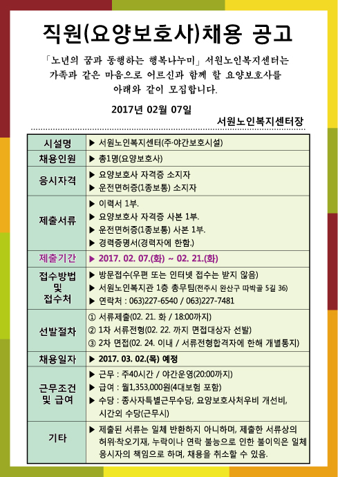 [모집공고] 서원노인복지센터 직원(요양보호사) 모집