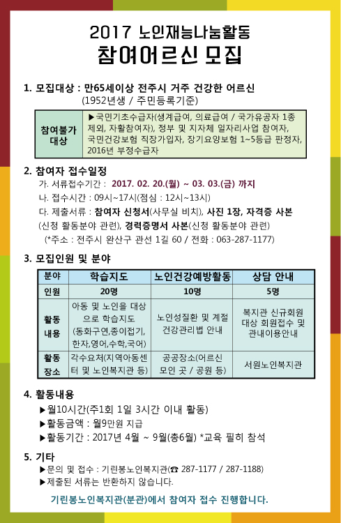 [재능나눔모집] 2017년 노인재능나눔활동 게시글 작성정보 작성자 서원노인복지관 작성일 17-02-15 00:00 조회수 1,772 댓글수 0 목록 게시글 본문 어르신의 많은 관심과 참여를 부탁드립니다. 첨부파일 1개 2017-jn(0215).jpg (189.3K) 0회 다운로드 첨부일시 : 2017-02-15 00:00:00 이전글 [주간식단] 2017년 2월(02.20~02.25) 복지관 주간식단 안내 17-02-20 다음글 [주간식단] 2017년 2월(02.13~02.18) 복지관 주간식단 안내 17-02-13 댓글 0 등록된 댓글이 없습니다. 목록