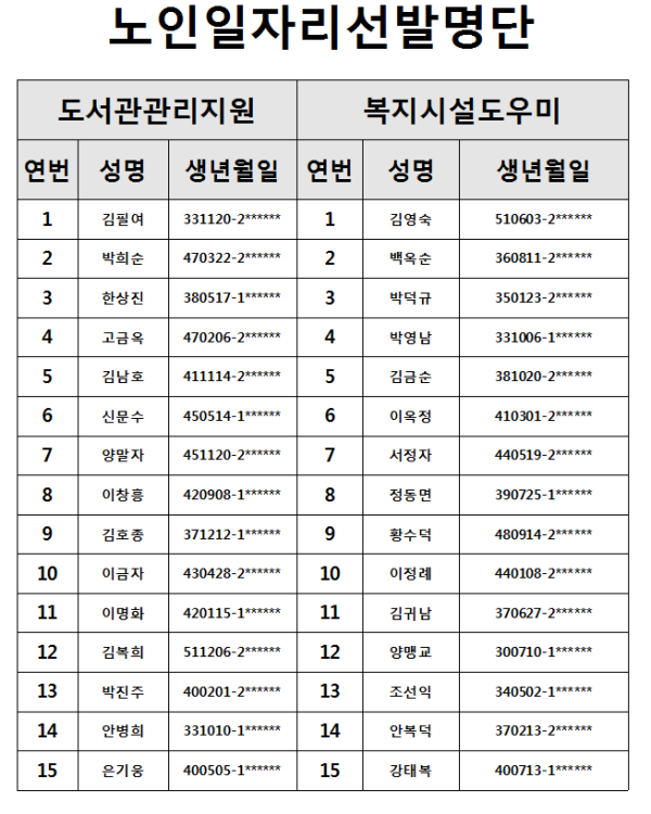 [노인일자리 및 사회활동지원사업 선발 관련]도서관관리지원사업, 복지시설도우미 선발자 명단