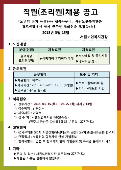 서원노인복지관은 함께 일할 경로식당 조리원을 모집합니다.