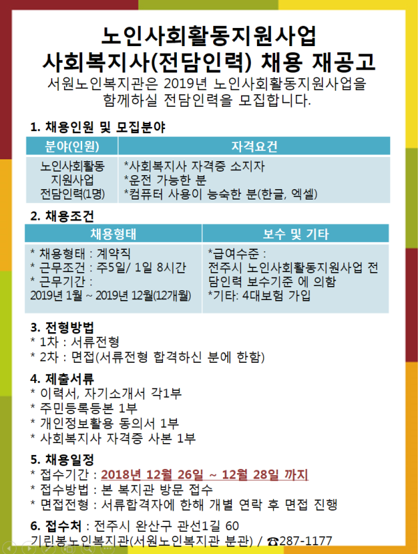 [모집공고] 서원노인복지관 사회복지사(노인사회활동지원사업전담인력) 재공고