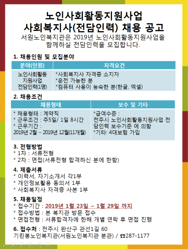 노인사회활동지원사업 전담인력 채용 모집 공고 입니다.