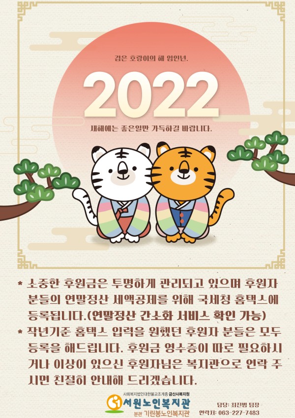 [연말 후원금영수증 안내] 국세청 홈택스 등록 게시글 작성정보 작성자 서원노인복지관 작성일 22-01-03 15:03 조회수 1,707 댓글수 0 목록 게시글 본문 첨부파일 1개 제목을-입력해주세요_-001 9.jpg (1.6M) 0회 다운로드 첨부일시 : 2022-01-03 15:03:00 이전글 [모집공고] 2022년 기린봉노인복지관 평생교육 강사 공개 모집 22-01-18 다음글 [회의 공개] 2021년 4분기 서원노인복지관 운영위원회 회의 공개 21-12-31 댓글 0 등록된 댓글이 없습니다. 목록