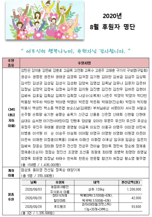 2020년 08월 후원자 현황입니다. 게시글 작성정보 작성자 서원노인복지관 작성일 20-09-03 14:43 조회수 2,242 댓글수 0 목록 게시글 본문 첨부파일 1개 2020년 8월 후원자 명단 홈페이지 - 변경.jpg (223.3K) 0회 다운로드 첨부일시 : 2020-09-03 14:43:13 이전글 2020년 09월 후원자 현황입니다. 20-10-06 다음글 2020년 07월 후원자 현황입니다. 20-08-12 댓글 0 등록된 댓글이 없습니다. 목록