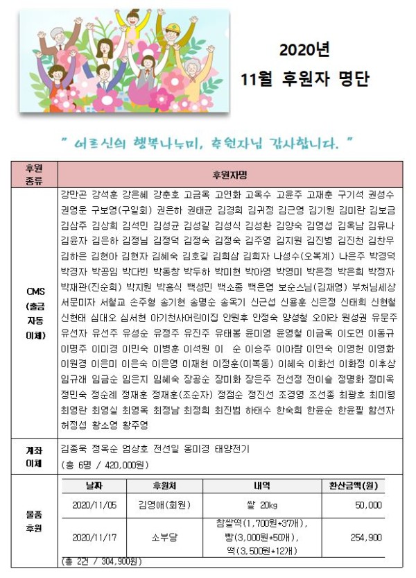 2020년 11월 후원자 현황입니다. 게시글 작성정보 작성자 서원노인복지관 작성일 20-12-08 10:20 조회수 2,125 댓글수 0 목록 게시글 본문 첨부파일 1개 2020년 11월 후원자 명단 홈페이지.JPG (143.0K) 0회 다운로드 첨부일시 : 2020-12-08 10:20:58 이전글 2020년 12월 후원자 현황입니다. 21-01-05 다음글 2020년 10월 후원자 현황입니다. 20-11-06 댓글 0 등록된 댓글이 없습니다. 목록