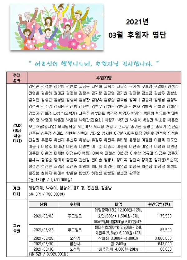 2021년 03월 후원자 현황입니다. 게시글 작성정보 작성자 서원노인복지관 작성일 21-04-05 15:05 조회수 1,583 댓글수 0 목록 게시글 본문 첨부파일 1개 2021년 03월 후원자 명단 홈페이지.jpg (226.0K) 0회 다운로드 첨부일시 : 2021-04-05 15:05:55 이전글 2021년 04월 후원자 현황입니다. 21-05-04 다음글 2021년 02월 후원자 현황입니다. 21-03-05 댓글 0 등록된 댓글이 없습니다. 목록