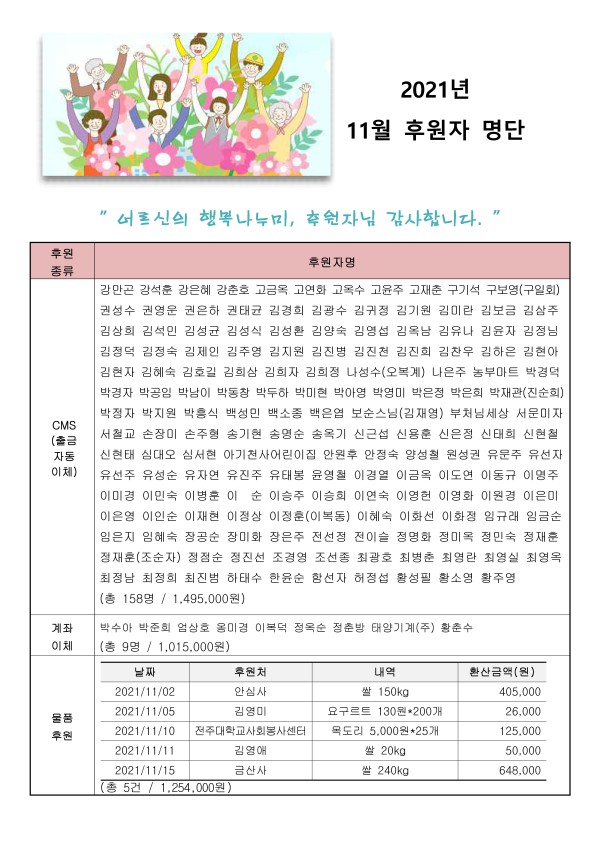 2021년 11월 후원자 현황입니다. 게시글 작성정보 작성자 서원노인복지관 작성일 21-12-09 17:41 조회수 1,442 댓글수 0 목록 게시글 본문 첨부파일 1개 2021년 11월 후원자 명단 홈페이지.jpg (3.3M) 0회 다운로드 첨부일시 : 2021-12-09 17:41:44 이전글 2021년 11월 자원봉사자 현황 21-12-14 다음글 2021년 10월 후원자 현황입니다. 21-11-10 댓글 0 등록된 댓글이 없습니다. 목록