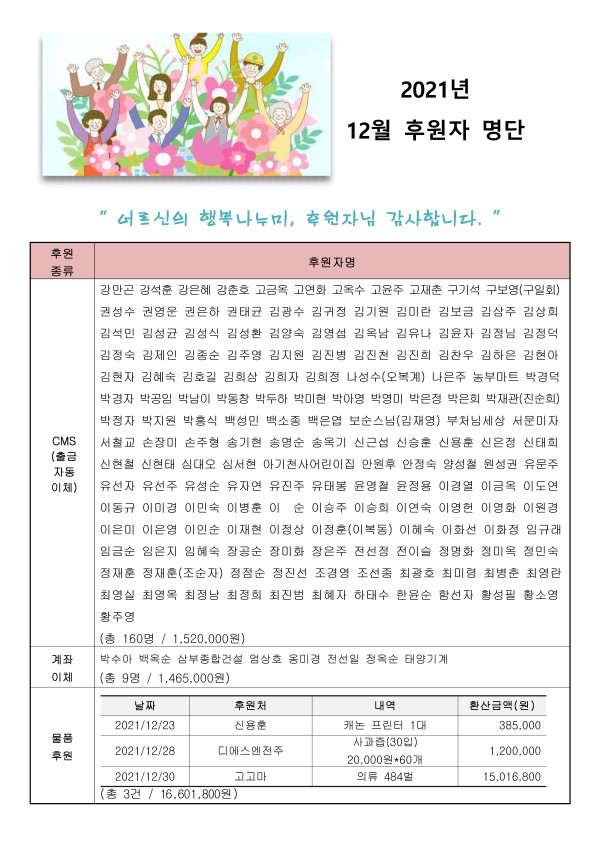 2021년 12월 후원자 현황입니다. 게시글 작성정보 작성자 서원노인복지관 작성일 22-01-06 11:13 조회수 1,349 댓글수 0 목록 게시글 본문 첨부파일 1개 2021년 12월 후원자 명단 홈페이지.jpg (3.3M) 0회 다운로드 첨부일시 : 2022-01-06 11:13:18 이전글 2022년 01월 후원자 현황입니다. 22-02-07 다음글 2021년 11월 자원봉사자 현황 21-12-14 댓글 0 등록된 댓글이 없습니다. 목록