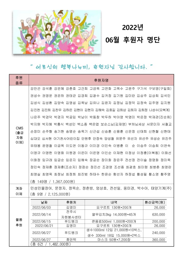 2022년 06월 후원자 현황입니다. 게시글 작성정보 작성자 서원노인복지관 작성일 22-07-05 11:39 조회수 1,166 댓글수 0 목록 게시글 본문 첨부파일 1개 2022년 06월 후원자 명단 홈페이지.jpg (3.4M) 0회 다운로드 첨부일시 : 2022-07-05 11:39:37 이전글 2022년 07월 후원자 현황입니다. 22-08-09 다음글 2022년 06월 자원봉사자 현황 22-06-30 댓글 0 등록된 댓글이 없습니다. 목록