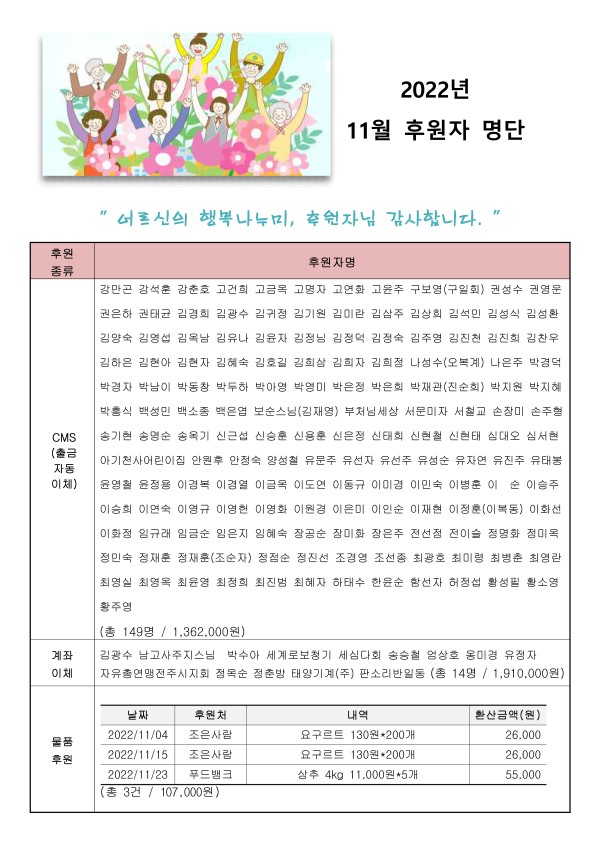 2022년 11월 후원자 현황입니다. 게시글 작성정보 작성자 서원노인복지관 작성일 22-12-06 16:36 조회수 1,005 댓글수 0 목록 게시글 본문 첨부파일 1개 2022년 11월 후원자 명단 홈페이지.jpg (3.2M) 0회 다운로드 첨부일시 : 2022-12-06 16:36:20 이전글 2022년 12월 자원봉사자 현황 23-01-02 다음글 2022년 11월 자원봉사자 현황 22-12-06 댓글 0 등록된 댓글이 없습니다. 목록