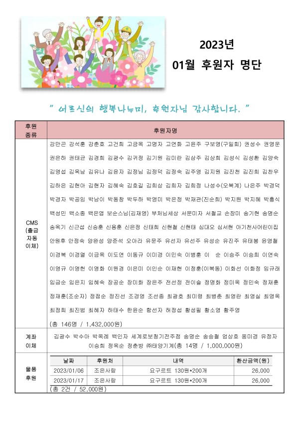 2023년 01월 후원자 현황입니다. 게시글 작성정보 작성자 서원노인복지관 작성일 23-02-03 16:21 조회수 920 댓글수 0 목록 게시글 본문 첨부파일 1개 2023년 01월 후원자 명단 홈페이지.jpg (3.1M) 0회 다운로드 첨부일시 : 2023-02-03 16:21:53 이전글 2023년 2월 자원봉사 현황 23-02-28 다음글 2023년 1월 자원봉사자 현황 23-01-31 댓글 0 등록된 댓글이 없습니다. 목록