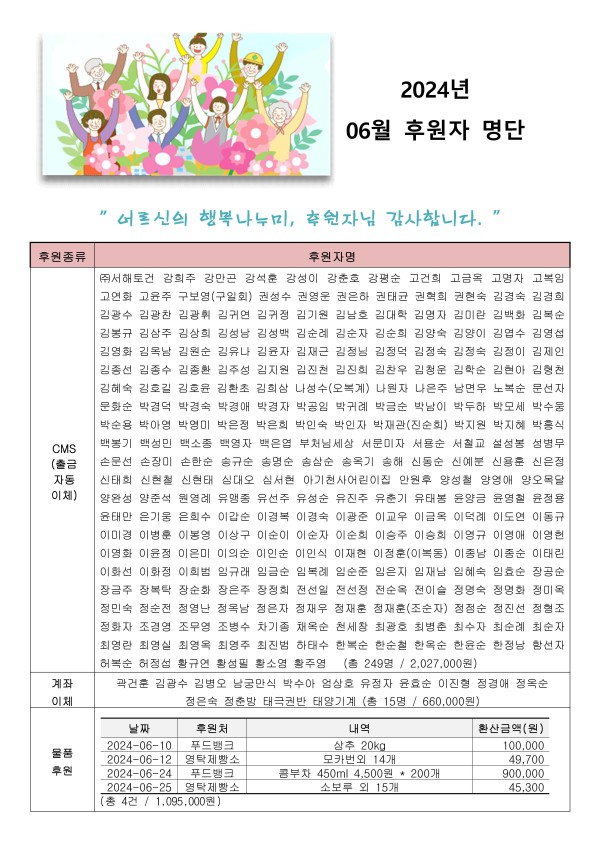 2024년 06월 후원자 현황입니다. 게시글 작성정보 작성자 서원노인복지관 작성일 24-07-04 15:36 조회수 471 댓글수 0 목록 게시글 본문 첨부파일 1개 2024년 06월 후원자 명단 홈페이지.jpg (2.0M) 0회 다운로드 첨부일시 : 2024-07-04 15:36:00 이전글 2024년 7월 자원봉사자 현황 24-08-01 다음글 2024년 6월 자원봉사자 현황 24-07-01 댓글 0 등록된 댓글이 없습니다. 목록