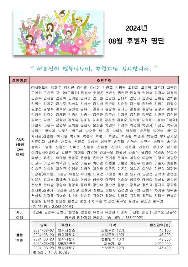 2024년 08월 후원자 현황입니다. 게시글 작성정보 작성자 서원노인복지관 작성일 24-09-06 16:09 조회수 680 댓글수 0 목록 게시글 본문 첨부파일 1개 2024년 08월 후원자 명단 홈페이지.jpg (2.0M) 0회 다운로드 첨부일시 : 2024-09-06 16:09:36 이전글 2024년 8월 자원봉사자 현황 24-09-12 다음글 2024년 07월 후원자 현황입니다. 24-08-13 댓글 0 등록된 댓글이 없습니다. 목록