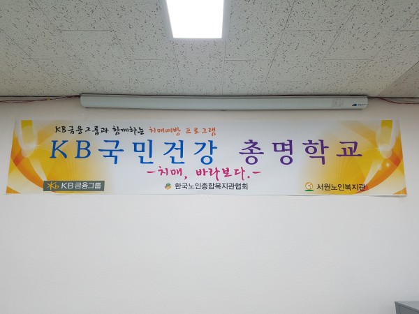 우리 서원노인복지관에서는 전국 30개 노인복지관에서 시행하는 2017년 KB국민건강 총명학교 수행기관으로 선정되어 치매 예방 프로그램을 진행하게 되었습니다. 2017년 9월 5일 1회기를 시작으로 총 12회기 프로그램을 진행 할 예정이며, "치매, 바라보다"라는 부제를 가지고 치매에 대해 바르게 알고, 나 먼저 보살피고, 다함께 극복하기 위한 프로그램으로 진행됩니다.