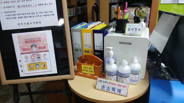 행복나눔 작은도서관에서 코로나19 바이러스 감염 예방을 위해 손소독제를 비치하였습니다.