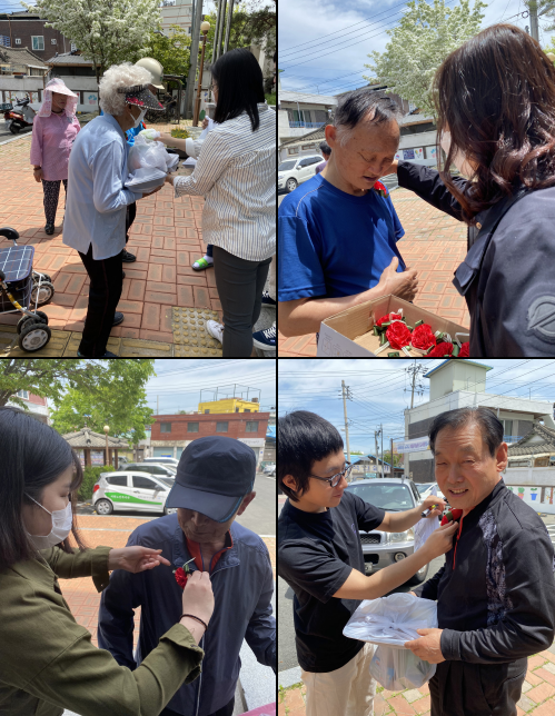 기린봉노인복지관에서는 2020년 어버이날을 맞이하여 어르신들에게 카네이션을 달아드리고, 선물꾸러미를 전달했습니다. 어르신들이 건강 챙기시면서 가족들과 행복한 어버이날을 보냈으면 좋겠습니다 ^0^