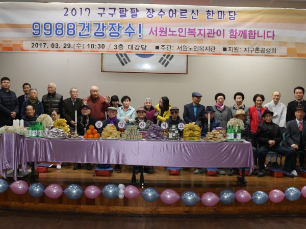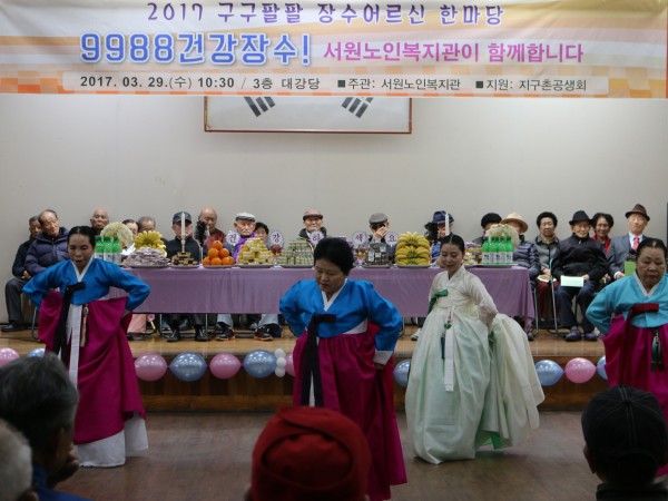 우리 서원노인복지관(관장 법은)은 지난 3월 29일(수) 복지관 회원 중 장수어르신(1930년 이전 출생 회원)과 이용 회원이 한자리에 모여 '구구팔팔' 장수어르신 한마당을 지구촌공생회의 지원을 받아 진행하였습니다.